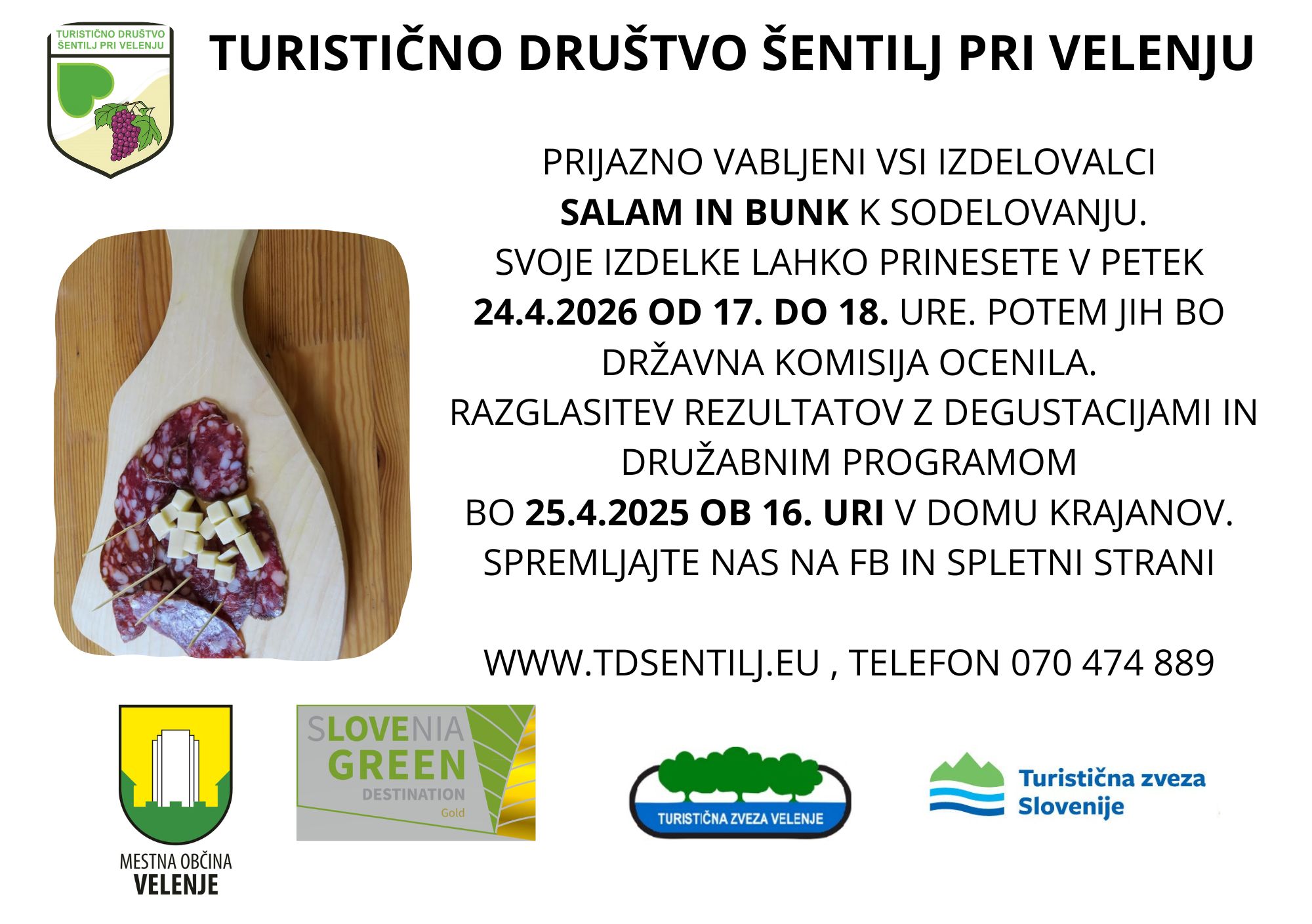 Za ocenitev vaših izdelkov se javite na naš naslov društva. Salame in bunke zbiramo v petek 24.4. od 17. ure do 18. h v dom krajanov v Šentilju pri Veleju.