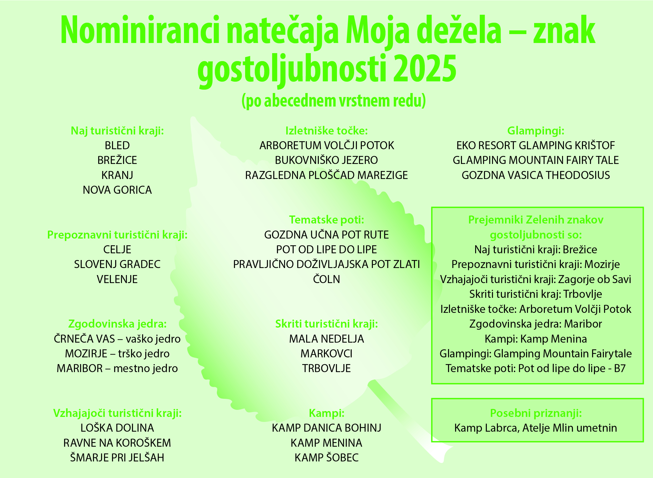 Vrhunec ponedeljkovega svečanega večera bo podelitev zlatih srebrnih in bronastih znakov gostoljubnosti najboljšim iz našega paradnega izbora Moja dežela – znak gostoljubnosti. Kraje smo na osnovi pobrane turistične takse razdelili na naslednje kategorije: naj turistični kraji, prepoznavni turistični kraji, vzhajajoči turistični kraji, skriti turistični kraji, izletniške točke, zgodovinska jedra, ocenjevali pa smo tudi kampe, glampinge in tematske poti. Podelili bomo tudi zelene znake gostoljubnosti, ki jih bodo prejele tiste destinacije iz vsake kategorije, ki ste jih izbrali s spletnim glasovanjem ter dve posebni priznanji.