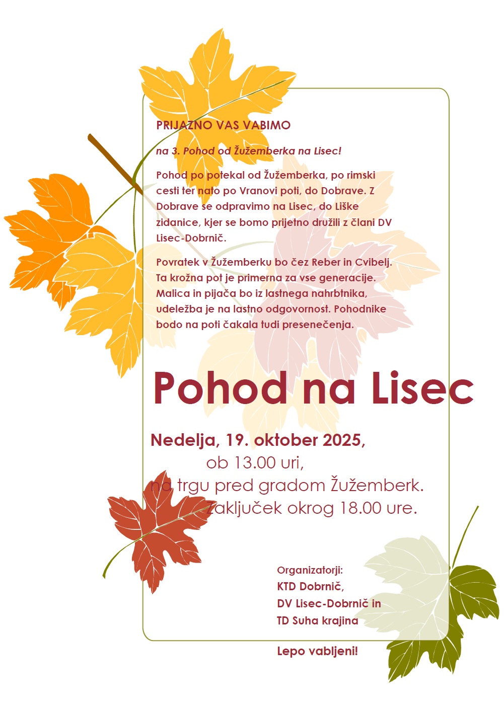 19. 10., ob 13:00, 3. Liški pohod od Žužemberka do Lisca in nazaj.