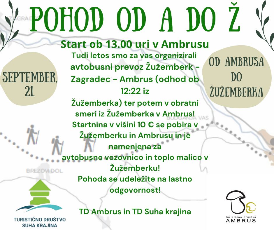 21. 9., ob 13:00, 7. Pohod od A do Ž, od Ambrusa do Žužemberka.