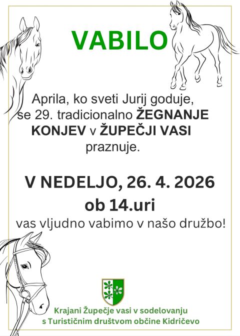 Aprila, ko sveti Juruj goduje, se 29. tradicionalno ŽEGNANJE KONJEV v ŽUPEČJI VASI praznuje.
