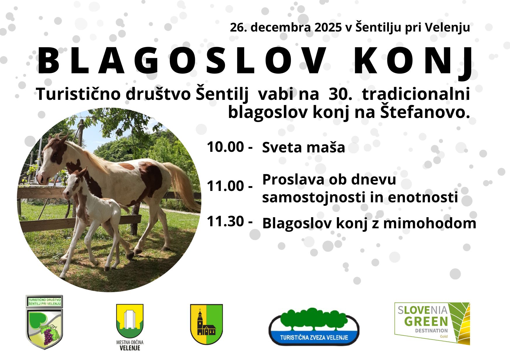 Prireditev poteka ob prazniku Dan samostojnosti in enotnosti zato v program vključimo tudi proslavo ob tem prazniku. Sam blagoslov poteka tako, da lastniki konj svoje živali vodijo mimo domačega župnika, ki blagoslov tudi opravi. Prireditve se veselijo tako lastniki konj kot tudi ljubitelji živali in narave. Srečajo se znanci, poklepetajo in si zaželijo srečo v prihajajočem letu. Seveda poskrbimo, da je vzdušje prijetno tako za oko kot za ostale čute.