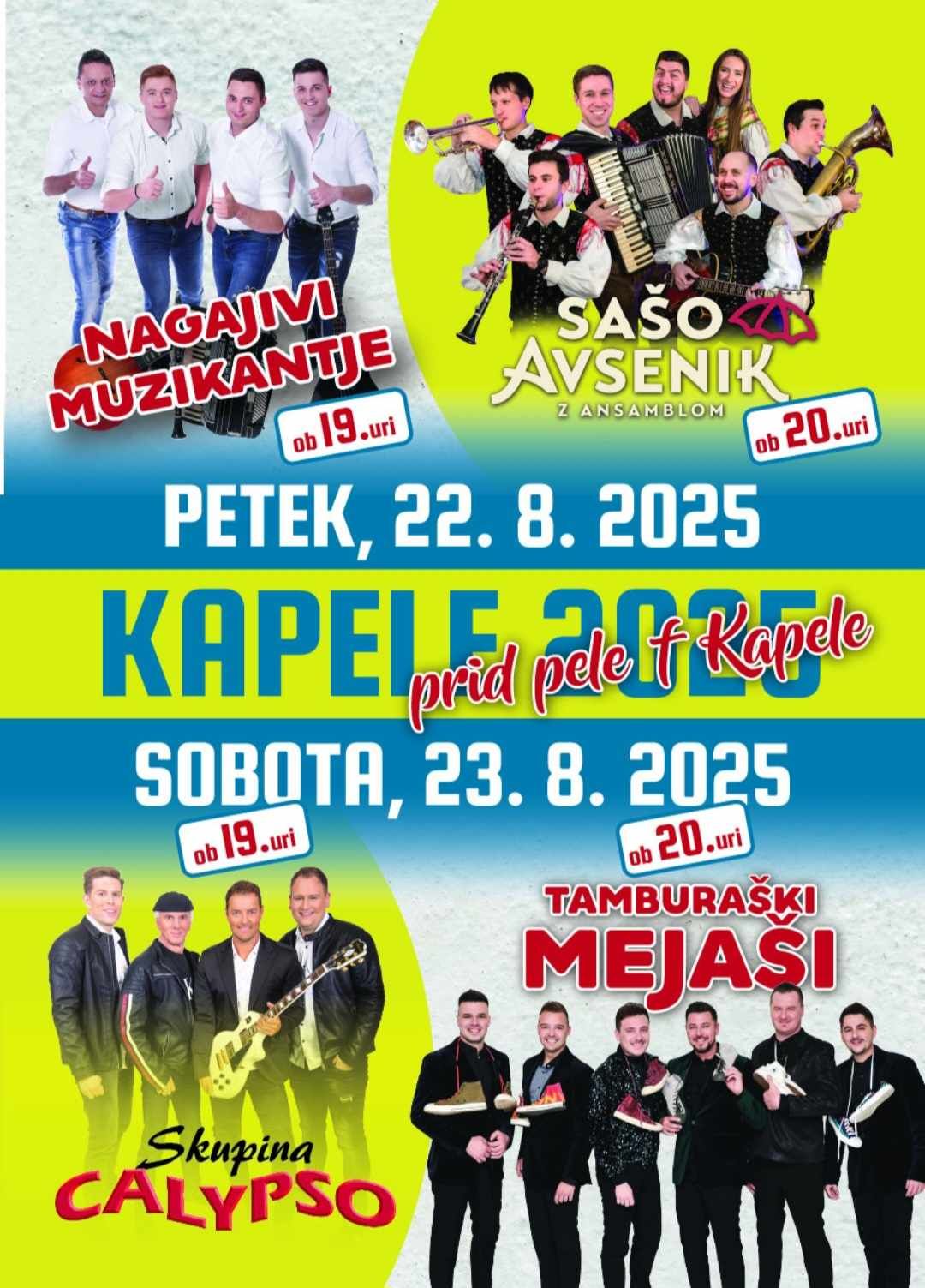V petek nas bodo zabavali Nagajivi muzikantje in Ansambel Saše Avsenika, v soboto pa skupina Calypso in Mejaši! Vabljeni v Kapele pri Brežicah