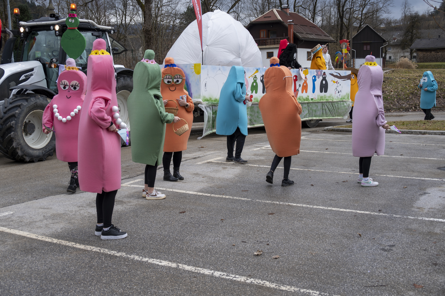 Pustna povorka z vozovi in posameznimi maskami.