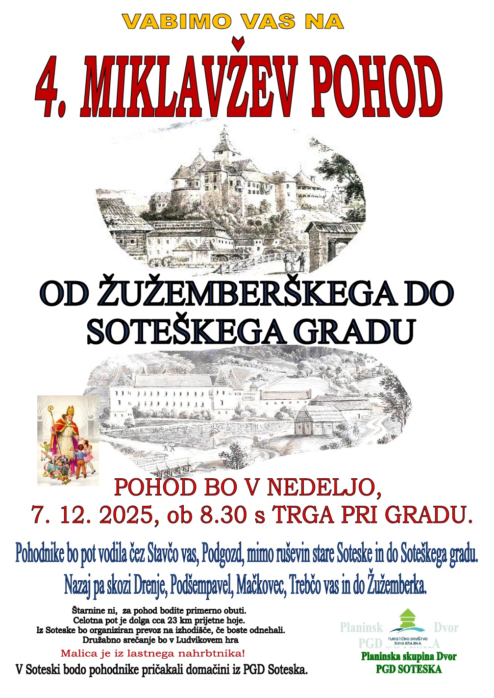 Vabimo vas na že 4. Miklavžev pohod od gradu Žužemberk do gradu Soteska, v nedeljo, 7. decembra 2025, s štartom ob 8:30 uri s trga pred gradom Žužemberk
